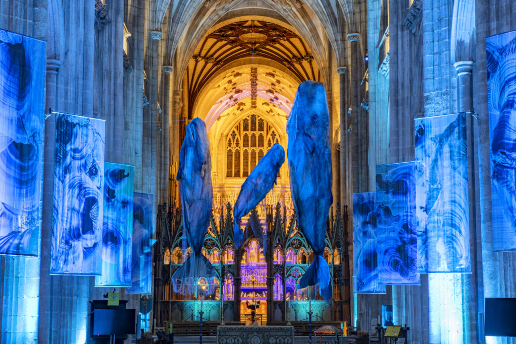 Whales was a newly-commissioned work to highlight our relationship with oceans and whales, transforming the Cathedral into an underwater themed, multisensory exhibition using sound, scent, lighting and sculptures made from ghost nets and recovered plastics. With strong accessibility features and climate messaging, it inspired 44% of visitors to pledge environmental action. Local partnerships helped to expand programming and reach diverse and younger audiences.