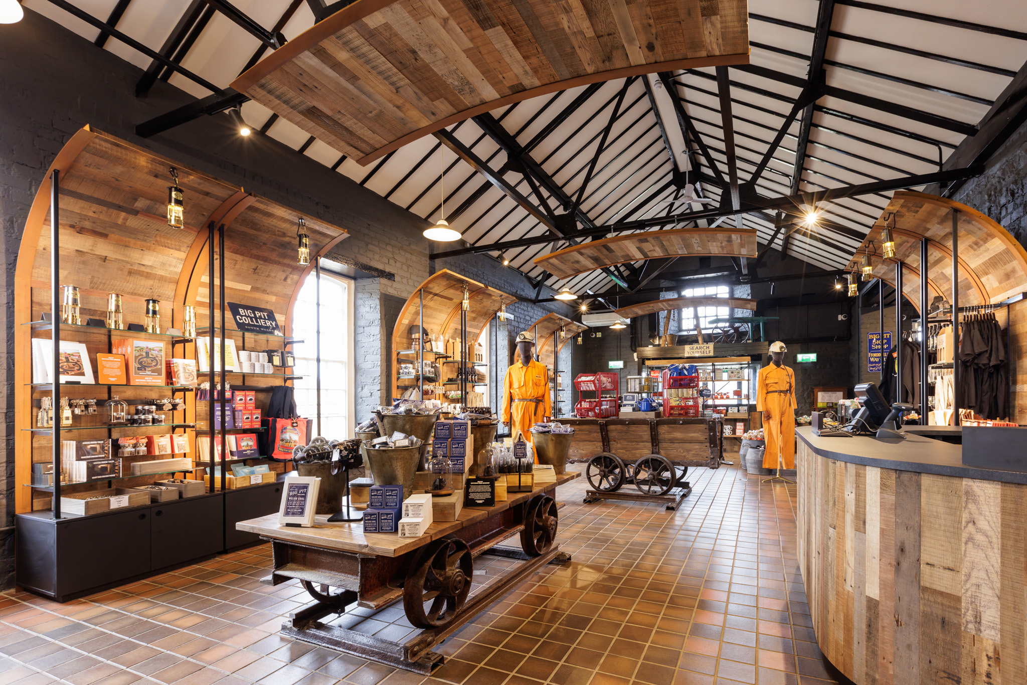 The shop at Big Pit National Coal Museum underwent a six-month redevelopment as a trial project to find ways to increase Amgueddfa Cymru brand standards and consistency whilst still representing the unique identity of each museum in the group. The redevelopment included creating 200+ bespoke products representing Big Pit’s stories and collections, as well as an immersive soundscape, a redesigned shop space using original collections and upcycling items from the former mine, and improved signage/messaging.