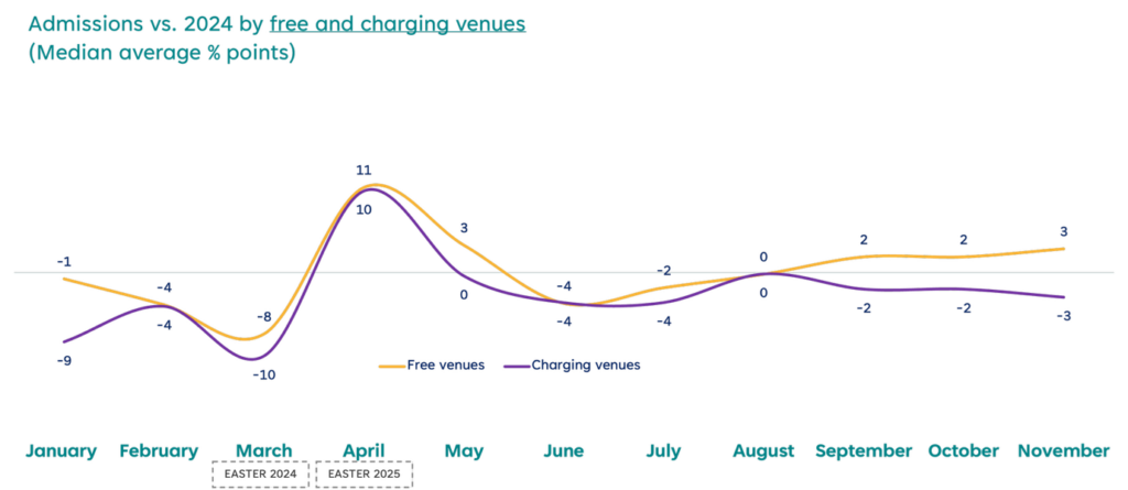 November 2025 is the eighth month this year where the cultural sector has reported lower admissions than in 2024 at -2%. Consistent with previous months, this fall is driven by charging venues (at -3%) – free venues reporting a positive month (at +3%).
