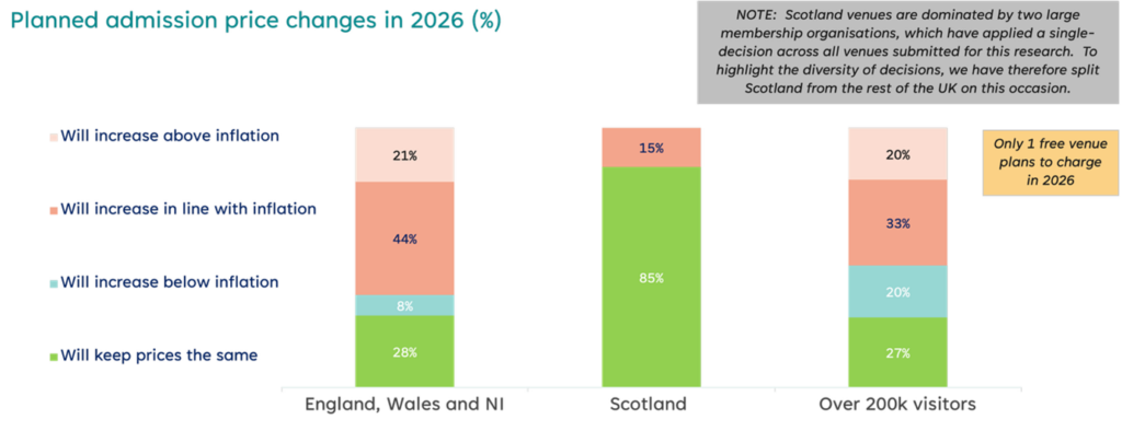 Each month when we’re gathering the latest data for the Cultural Enterprises Commercial Performance Barometer, we ask members a special question around one aspect of their commercial performance. In November 2025 we asked about their plans for increasing entry fees in 2026.