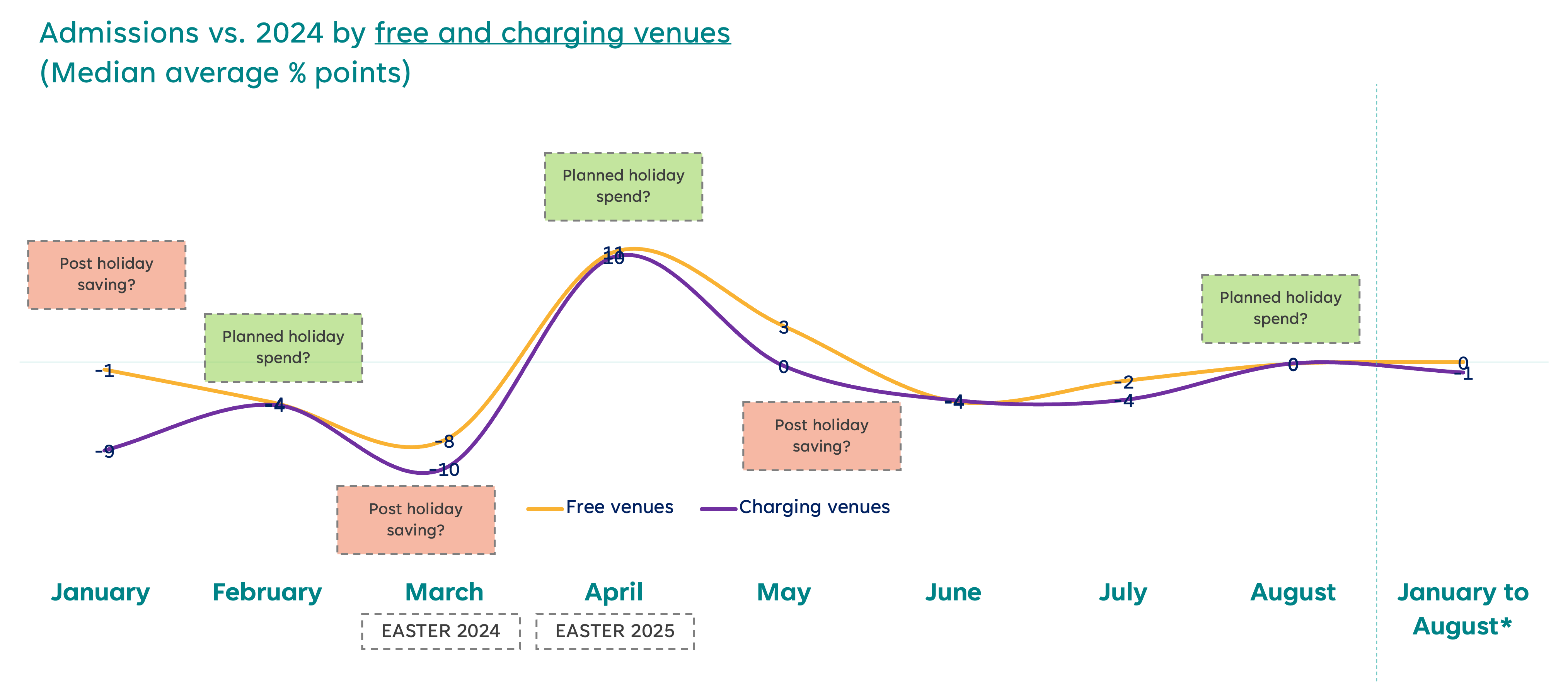 However, there are definitely signs that financial fears are impacting spend. One example of this is admissions reporting from ‘charging venues’, which are 2% down on 2024, compared to 0% for free venues. What’s particularly notable amongst the charging cohort is that the main drop-offs occur in the months immediately after school holidays, suggesting that families may be spending as normal during the school break but cutting back after.