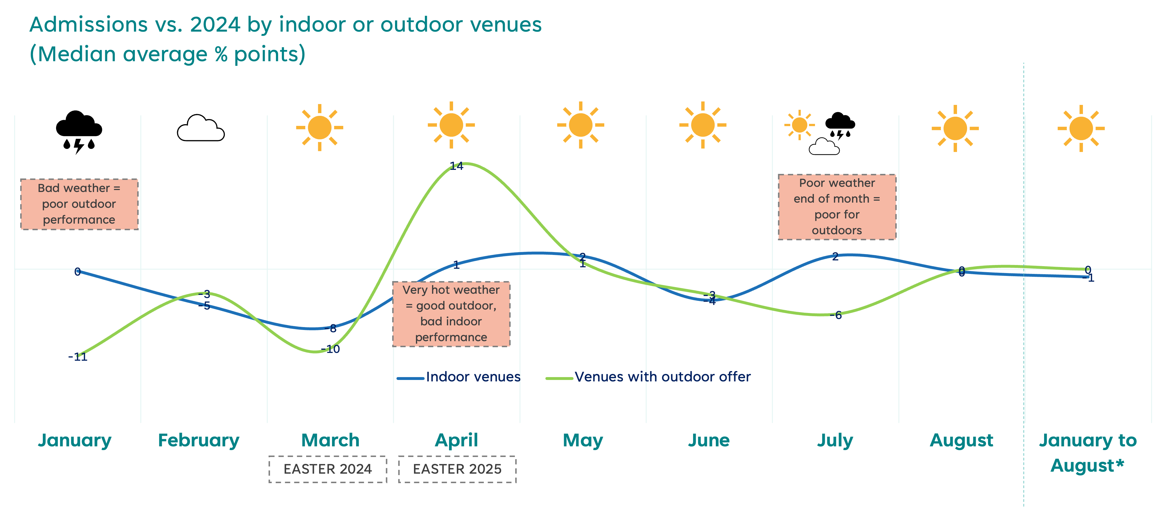 Any assessment of 2025 should consider weather. By my reading (via the Met Office), we have experienced extreme storms or extreme heat in six out of eight month so far this year. This has led to indoor and outdoor venues experiencing a potluck of fortunes relative to a year earlier, and venues citing it as the main driver of performance in almost every month.
